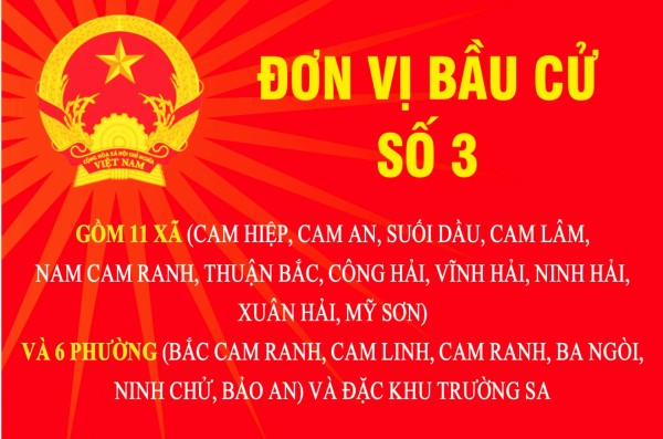 Trân trọng giới thiệu đến cử tri trong tỉnh chương trình hành động của những người ứng cử đại biểu Quốc hội khóa XVI tại Khánh Hòa tại Đơn vị bầu cử số 3 (Gồm 11 xã: Cam Hiệp, Cam An, Suối Dầu, Cam Lâm, Nam Cam Ranh, Thuận Bắc, Công Hải, Vĩnh Hải, Ninh Hải, Xuân Hải, Mỹ Sơn; 6 phường: Bắc Cam Ranh, Cam Linh, Cam Ranh, Ba Ngòi, Ninh Chử, Bảo An; và đặc khu Trường Sa)